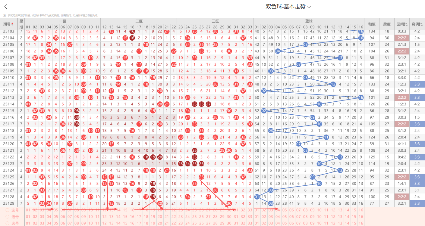 上期开出小号奇数03,从走势上号码整体分布结合折线运行轨迹本期蓝球重点关注五码03 08 09 13 16参考。有关更多详细选号思路以及号码组合搭配 我们15:00~17:30点有选号思路详细解析的直播节目欢迎大家前来一起探讨交流。
