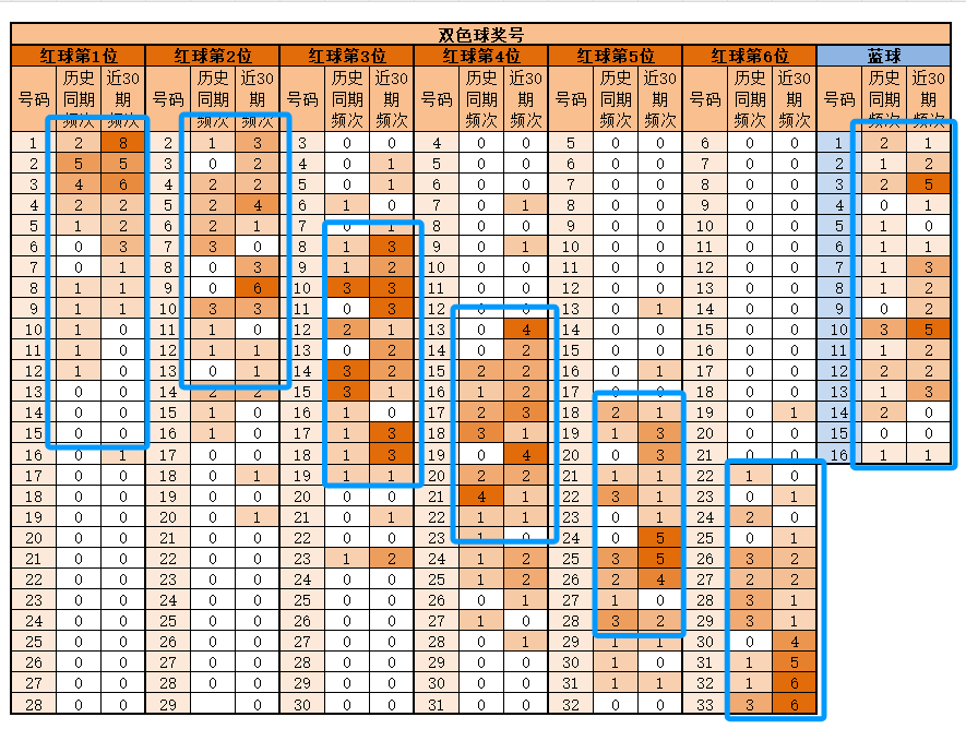 蓝球,历史同期频次最多的为10;近30频次最多的为3-10,明显特征是1优势;推荐重点3-7-8-10-12-13-16