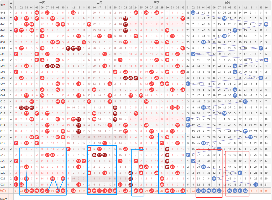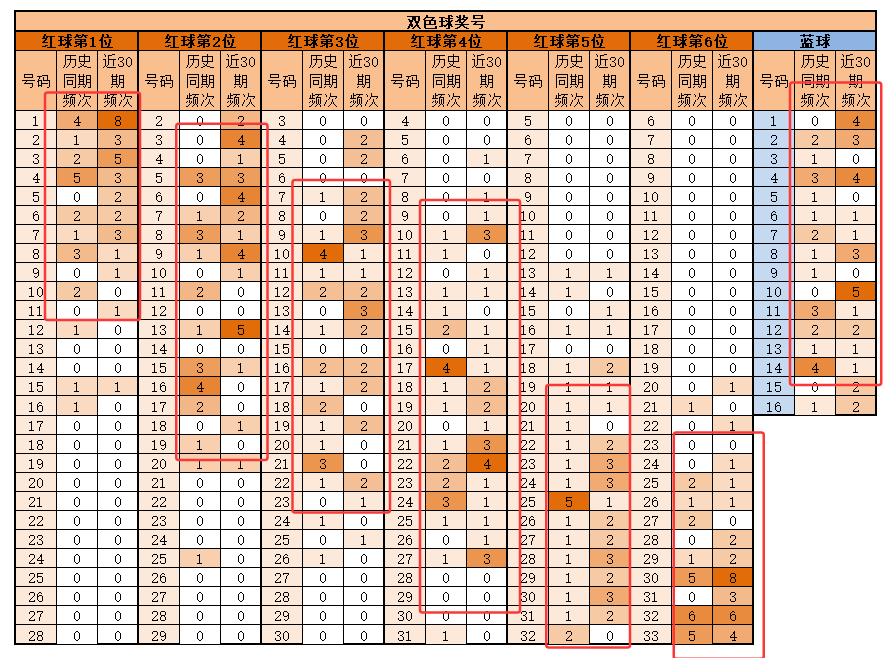 6位,基本在24-33之间,历史同期频次最多的3230期,频次最多的为30,明显特征是合数优势;推荐重28-30-31-32-33