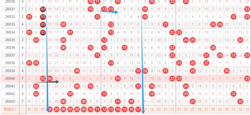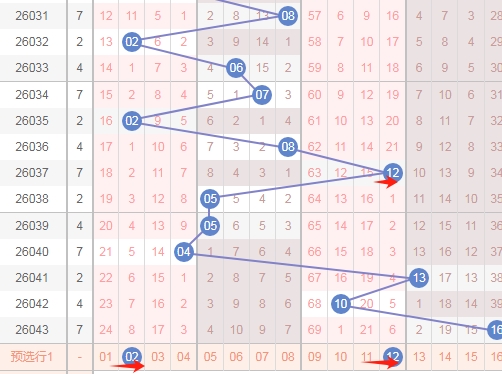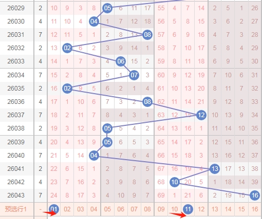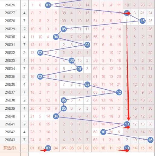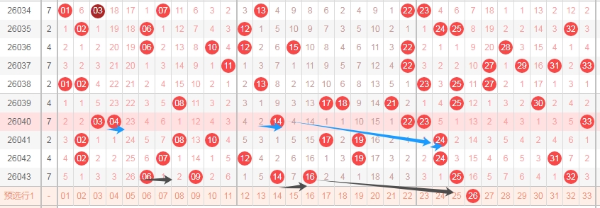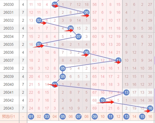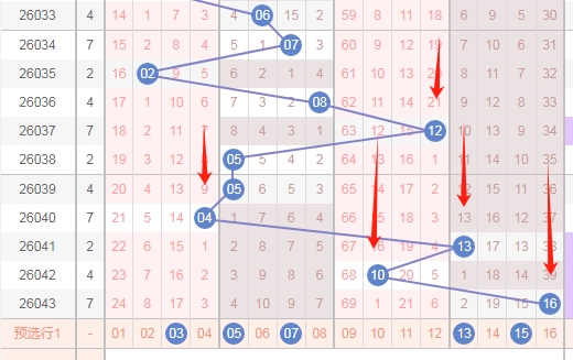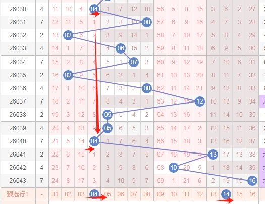 上图是福彩双色球红球开奖号码走势分布图,我标注出来的蓝色小箭头表示特点,你们看上面出现了04 14后一期就出现了24,那么上期开出了06 16本期会不会根据这个特点开出数字26呢?