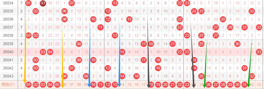 上图是福彩双色球红球开奖号码走势分布图,我标注出来的黄色箭头中间的数字01 02 03 04 05一共是5个数字,上期一个数字都没出现,最近3期只开出了两个数字,那么本期这个区域的数字可以关注出一个或者两个。我标注出来的蓝色箭头中间的数字10 11 12 13一共有数字4个,上期一个数字没出现,最近5期这个区域也开出了两个数字,那么本期这个区域的数字可以关注出一个或者两个。我标注出来的黑色箭头中间的数字18 19 20 21 22 23一共有6个,上期一个数字都没出现,最近3期这个区域出号码两个,那么本期这个区域的数字可以关注出2个或者3个。我标注出来的绿色箭头中间的数字26 27 28 29 30 31一共有6个,上期一个数字没出现,最近4期这个区域也只开出了一个数字,那么本期这个区域的数字可以关注出2个或者三个。
