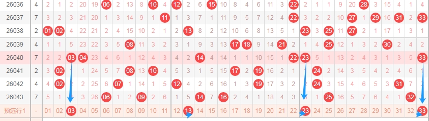 上图是福彩双色球红球开奖号码走势分布图,我标注出来的数字是3尾数数字,到本期为止3尾数的数字已经连续遗漏了3期,那么本期或者近期大家还是要留意一下3尾数的数字03 13 23 33出一个或者两个。