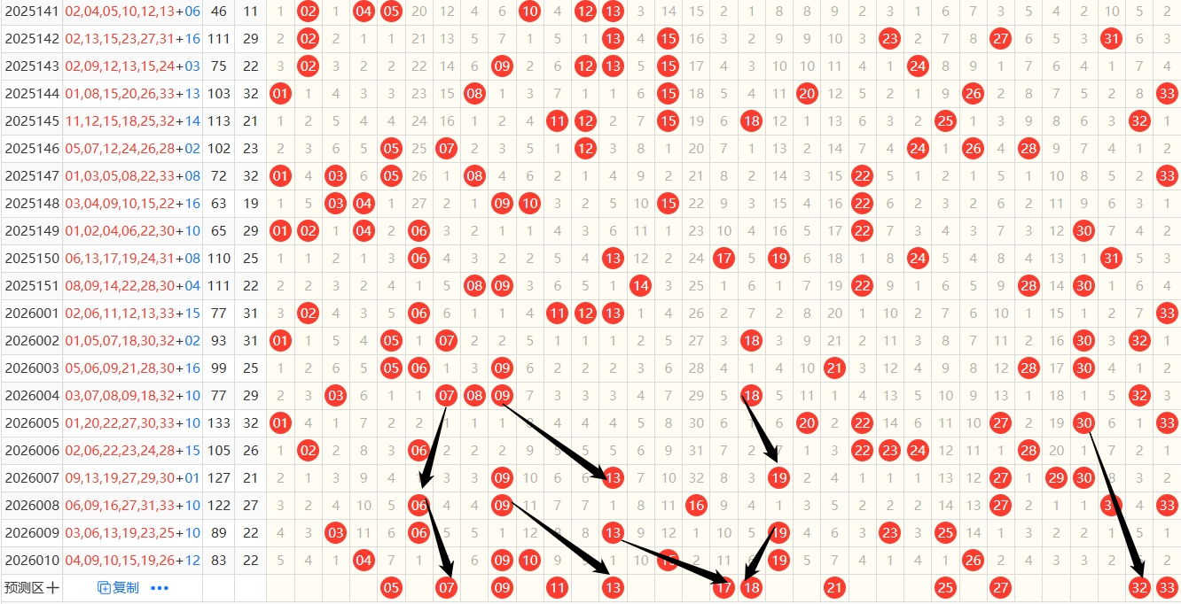 回顾上期26010期开奖06 09 16 27 31 33+ 10   ,其中一小区01-11出3个,二小区12-22出2个号,三小区23-33出1个!