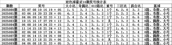 上期开出1个重号:18,近10期重号共开出11个,分布在8期中,出现比例较高,本期注意重号走冷,防上期6个中奖红球全部轮空。