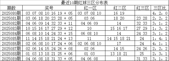一区上期走热,开出3个红球,近10期开出25个红球,表现非常活跃,本期预计走温,开出1-2个红球,参考号码03;二区上期走温,开出1个红球,近10期共开出20个红球,出号比例与理论持平,本期看好走热,开出3个红球,注意号码12、16、17;三区上期走温,开出2个红球,近10期共开出15个红球,走势相对较冷,本期预计继续温冷,看好号码23、24;