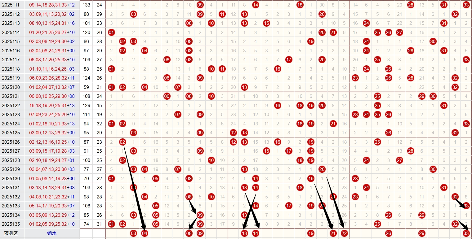 回顾上期25135期开奖01 02 05 09 25 32 + 10 ,其中一小区01-11出4个,二小区12-22出0个号,三小区23-33出2个!