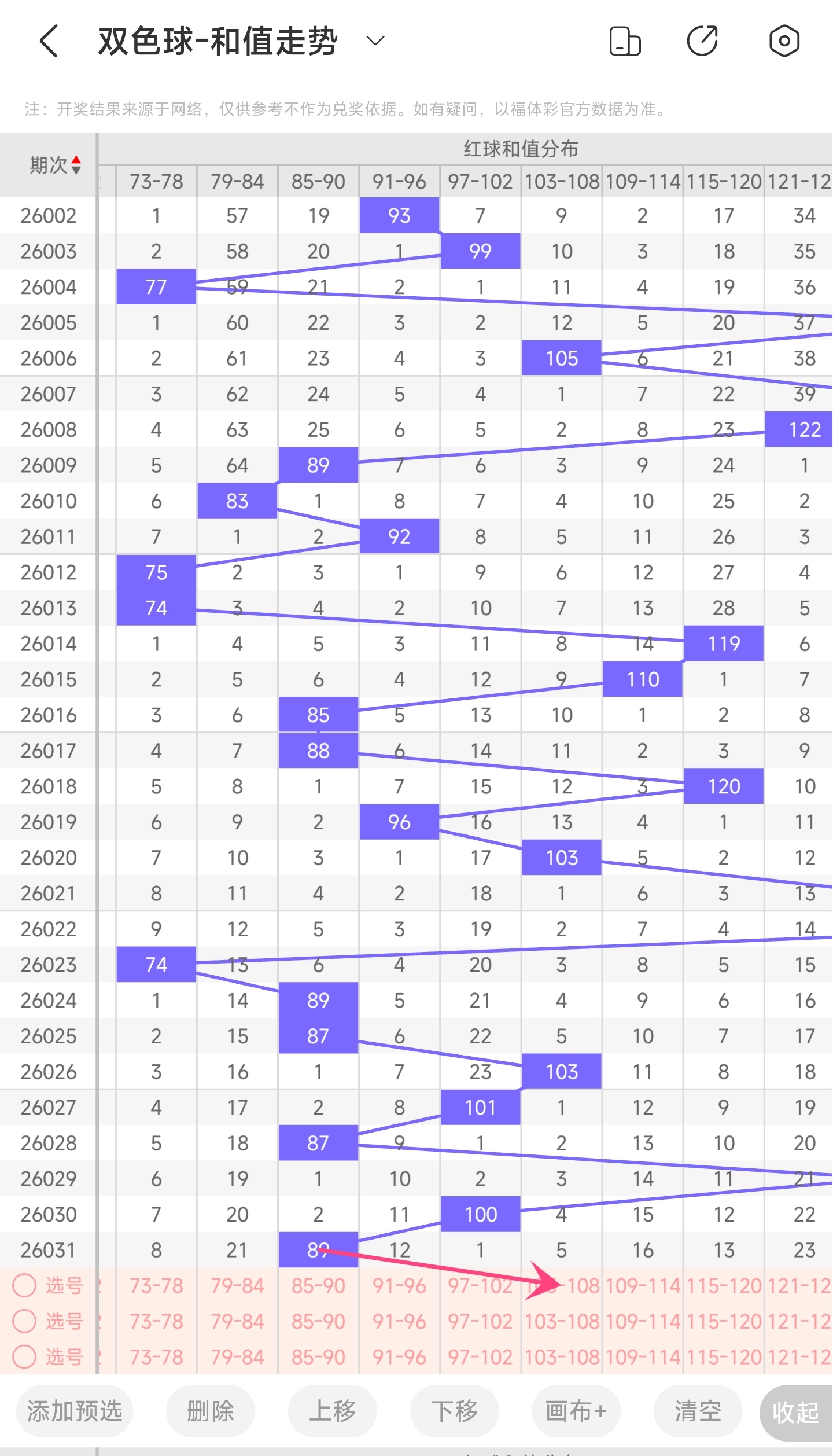 上期龙头为3,凤尾为33,跨度为30,往前一期跨度是14,偏移量为16。30跨度值是30期内开出很大的跨度值。下降的空间比较大,上升空间很小,再根据最近龙头凤尾走势,本期跨度可能会变小,所以推测本期跨度趋势是往左的,跨度变小,小概率往右,跨度变大。