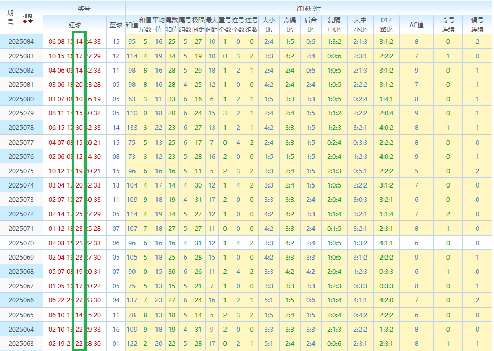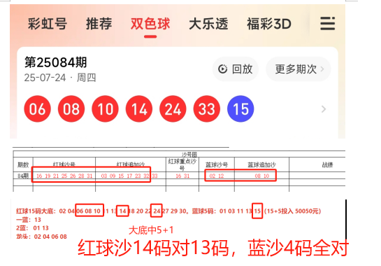 先回顾双色球第25084开奖号码:06 08 10 14 24 33—15。上期红球杀14码对13码,大底中5+1等