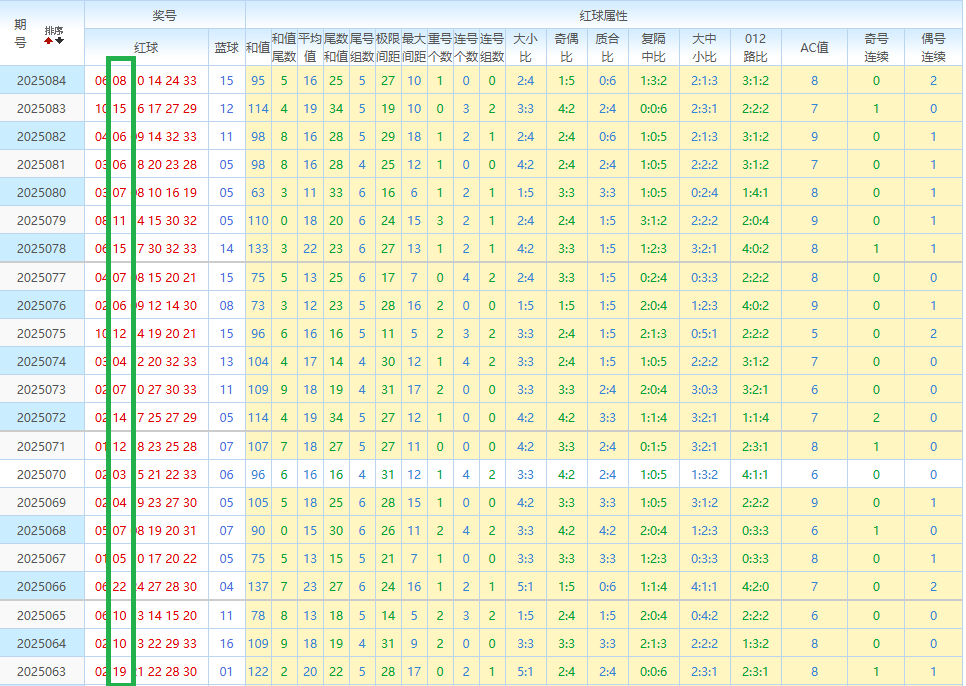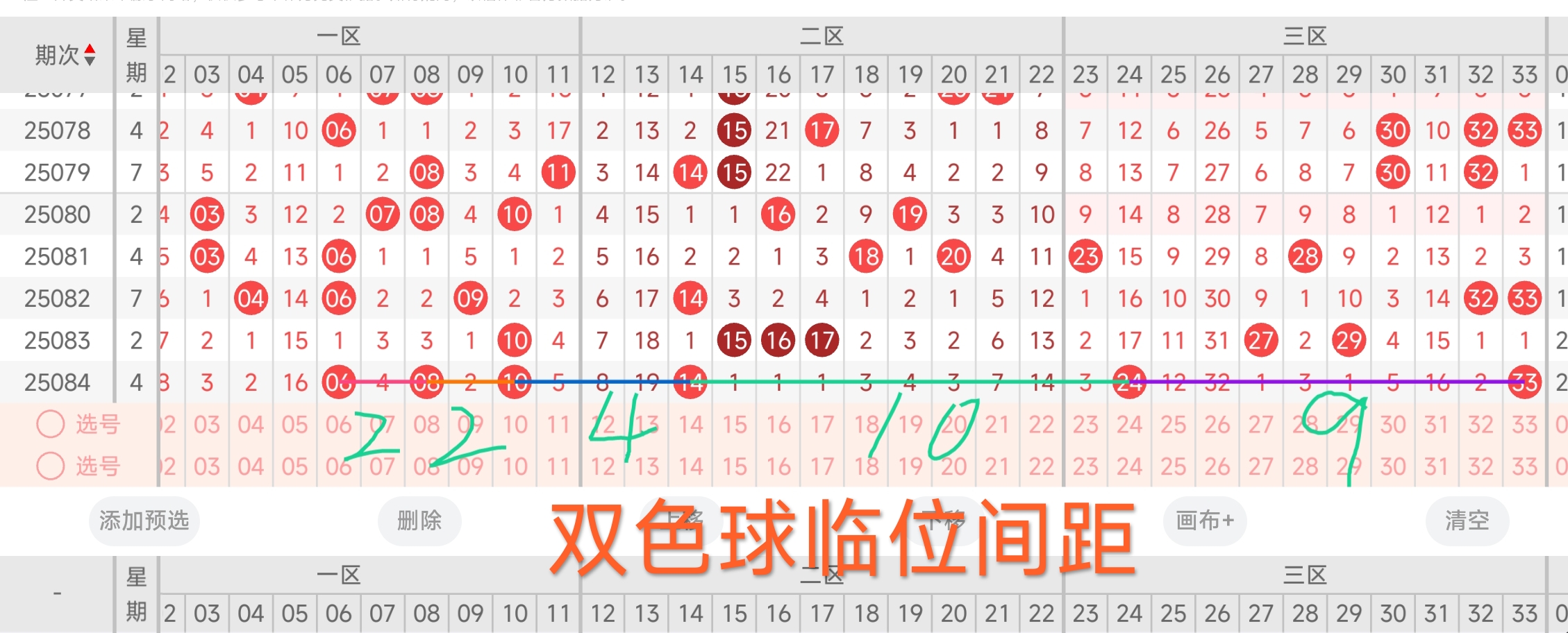 临位间距分析解释:红球开奖号码从小到大排列共有6个数,他们之间相互的距离,如上期开奖03 07 08 10 16 19,那么第一位和第二位的球间距就是4.
