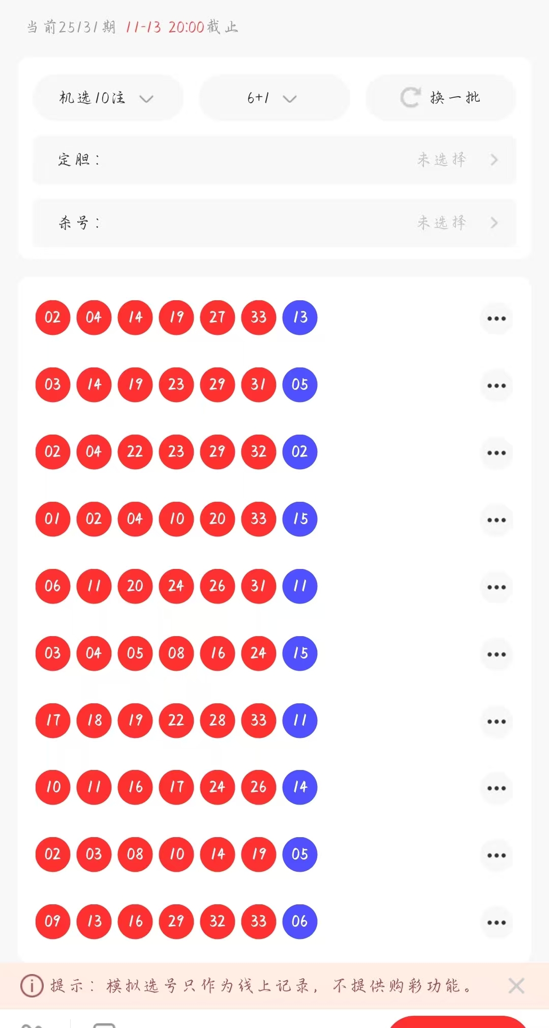 路径就是彩虹软件里面的模拟选好功能,然后选择机选,机选10注,这样我们就会得到一组10注的号码,我们需要大量的10注号码然后进行统计,我这里的选择是蓝码选择3组25注的统计,3组50注的统计,红码选择的是3组25注的统计,然后对数据进行对比研究,可以查看统计的情况记录,如下图(关注必杀蓝码重点:连续的组数据进行从下面开始网上开始10个码,然后通过两两对比,得出相同出号的作为选码,如果超过了5个号码就人工的筛选杀号,凑到5码均可,这里有一个重点就是每一组数据都是通过上面截图的办法出来的25组单注,然后通过3次25组单注的合计出来一组蓝码,通过这样的方式出来的选号,准确率尚且较高,可以有不少的参考价值)