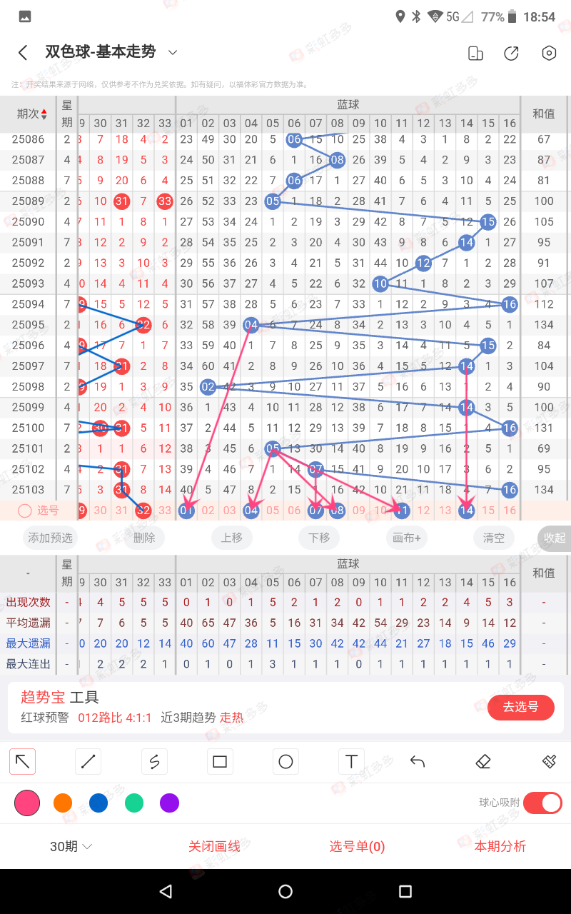 这个说明,二个红1+红2相加得出的和值,可以排除那个路数,也会错,甚至连错,抓有效规律,直到错为止,070,086,090-098-101-102期错这期的蓝 2路需考虑,本期防隔期错