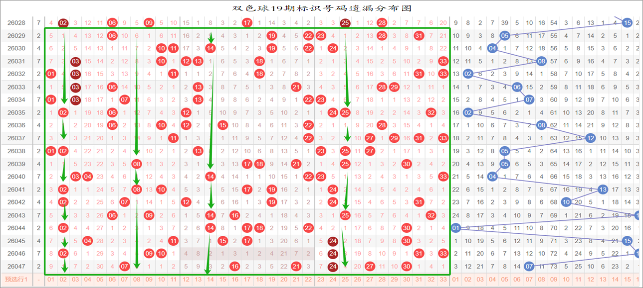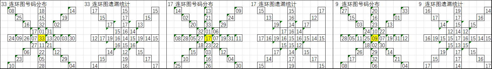 由于数据量大,不一一统计,下图为各个号码分别在33、17、9连环图上的遗漏统计汇总图: