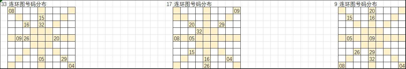 以上是33、17、9的连环图,可以在一起彩平台的九转连环图中查看历期号码分布,以当前期数来看,我们以19期号码来进行遗漏统计,然后把每个号码在近19期的遗漏总数统计出来,分别带入33、17、9的连环图,取出遗漏值大于16的号码,把这些号码在“环上”和“轴上”的相邻号码取出来进行统计,选取出次前15的号码作为大底。