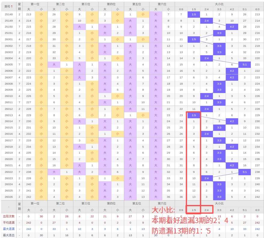 上期大小比:3:3,近10期大小比出现情况:3:3、4:2、3:3、3:3、4:2、5:1、2:4、3:3、3:3、3:3,最近10期出现6期3:3,出现2期4:2,出1期2:4,出现1期5:1,出现0期1:5,出现0期6:0,出现0期0:6,根据近10期规律本期看好遗漏3期的2:4,防遗漏13期的1:5,综上所述推荐大小比推荐:1:5,重点关注:2:4。