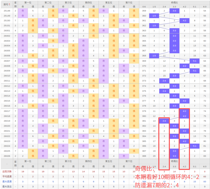 上期奇偶比:3:3,近10期奇偶比出现情况:4:2、4:2、2:4、3:3、4:2、3:3、4:2、5:1、3:3、3:3,最近10期出现4期3:3,出现4期4:2,出现1期2:4,出现1期5:1,出现0期1:5,出现0期6:0,出现0期0:6,根据近10期规律本期看好10期循环4:2,防遗漏7期出2:4,综上所述推荐奇偶比推荐:2:4,重点关注:4:2。