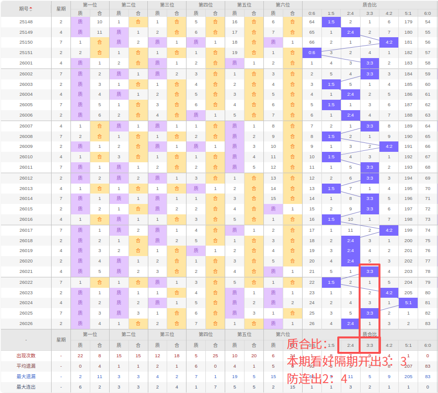 上期质合比:2:4,近10期质合比出现情况:4:2、2:4、2:4、2:4、3:3、1:5、4:2、5:1、3:3、2:4,最近10期出2期3:3,出现2期4:2,出现4期2:4,出现1期5:1,出现1期1:5,出现0期6:0,出现0期0:6,根据近10期规律本期看好隔期出3:3,防连出的2:4,综上所述推荐质合比推荐:2:4,重点关注:3:3。