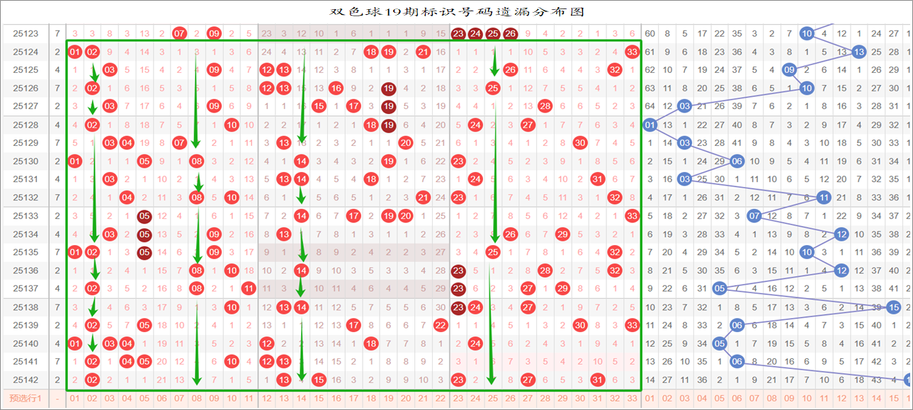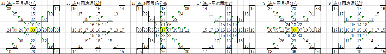 由于数据量大,不一一统计,下图为各个号码分别在33、17、9连环图上的遗漏统计汇总图: