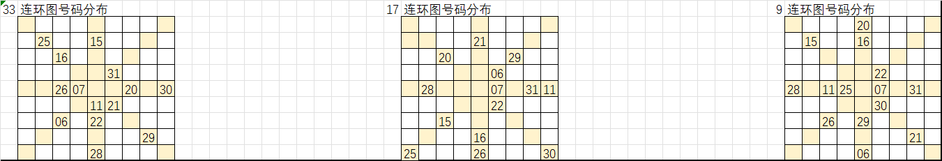 以上是遗漏大于16的号码分别在33、17、9连环图的分布,按照九转连环图选号规律,选取这些号码“环上”和“轴上”的相邻号码作为胆码,把这些胆码进行次数统计即可形成我们组号的排序,从出次多到少进行取号得出我们的大底。