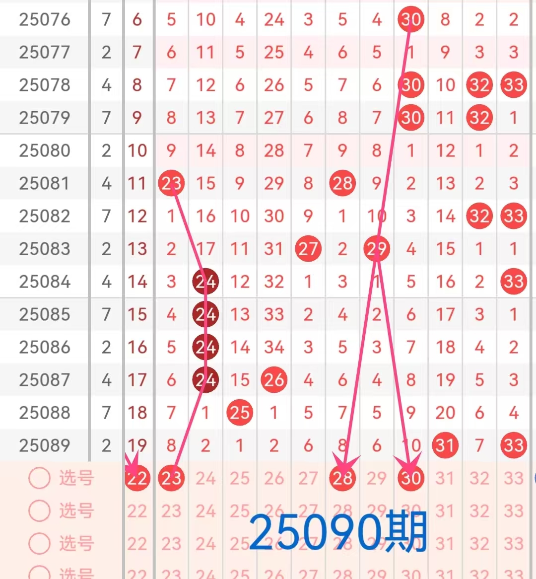 2.凤尾分析:上期凤尾为33,本期预计凤尾会有下降,重点关注22、23、28、30这四个号码。