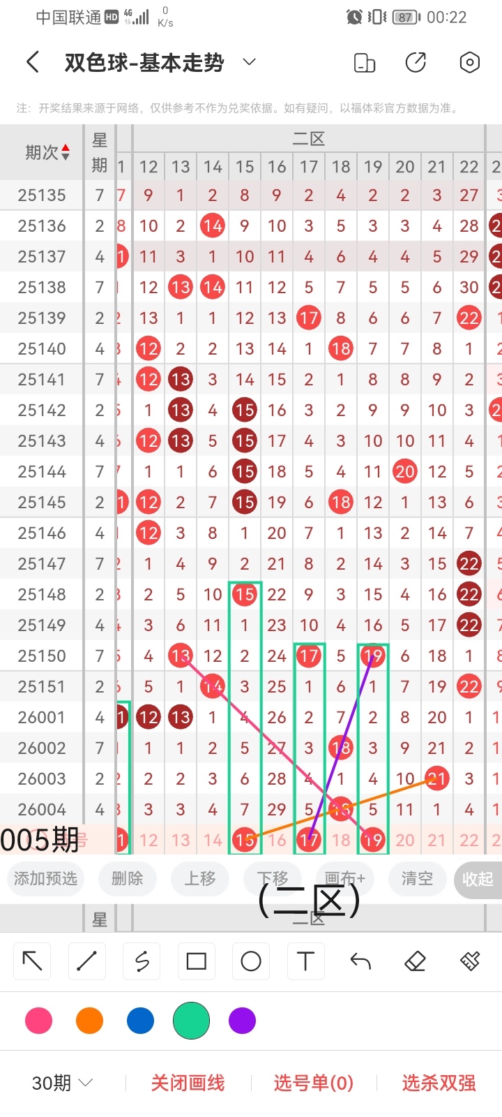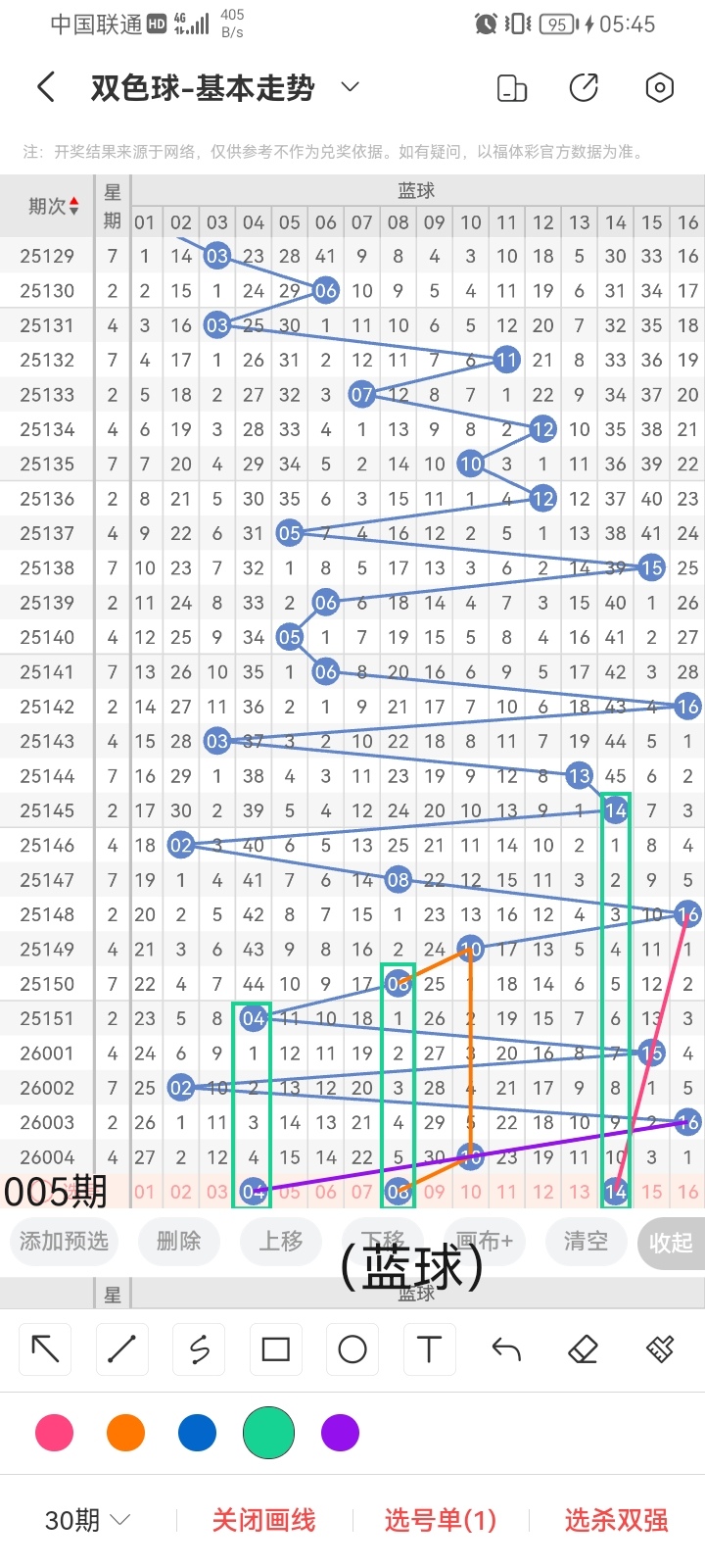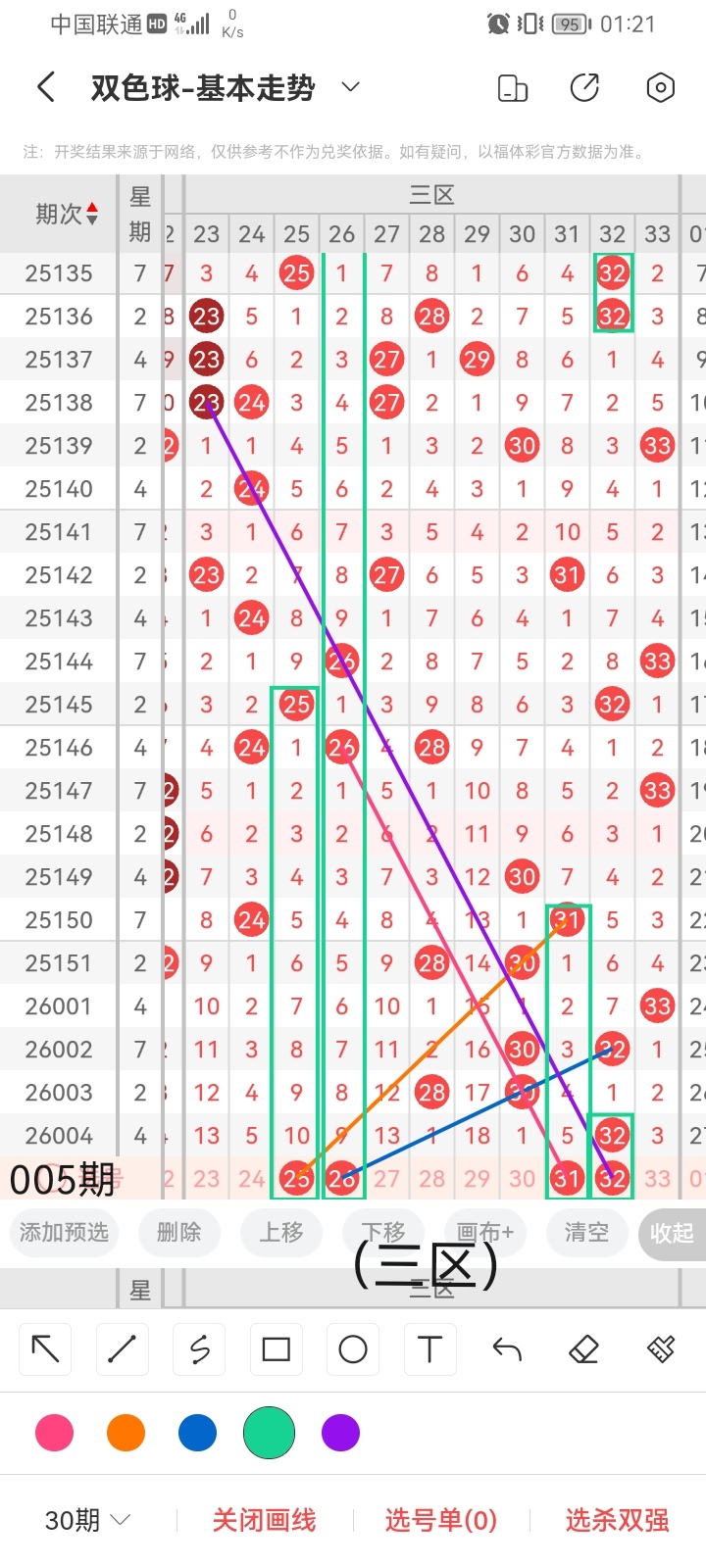 小梁结合上面图中画线思路的论证,最后给大家汇总提供一下本期红球、蓝球数据,供大家参考: