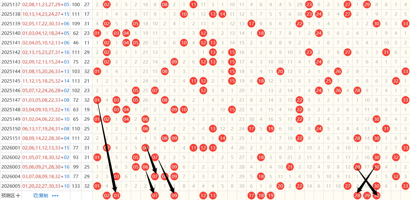 回顾上期26005期开奖01 20 22 27 30 33 + 10   ,其中一小区01-11出1个,二小区12-22出2个号,三小区23-33出3个!