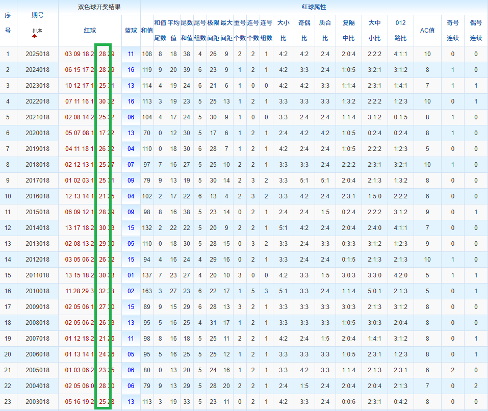 往年同期中选取出现次数靠前的数作为我们的分析对象,其数据有:28 17 30 25 06等