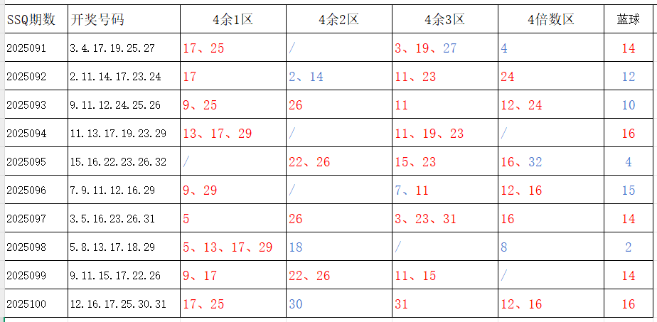 首先看上期回顾,双色球2025100期开奖结果:12.16.17.25.30.31+16。其中红球号码开出:4余1区号码2个,4余2区号码1个,4余3区号码1个,4倍数区号码2个。蓝球号码:冷号重开。再看上期个人分析:胆尾中出5尾5码!红球杀号全对,蓝球杀号全对!恭喜中出的虹友!