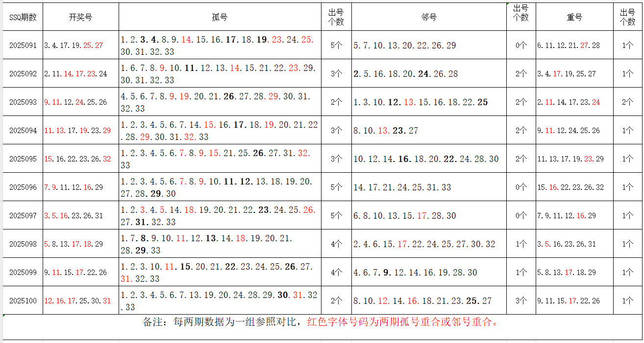 如图,以近两期数据为一组,进行对比分析。相同的孤号、邻号,可能在下期出1-4个左右。上期孤号开出2个,邻号开出3个,重号1个。本期参考孤号:1.2.3.4.5.6.7.8.9.10.14.19.20.21.22.23.27.28.33;邻号:11.13.15.18.24.26.29.32。孤、邻号重合号码精选:***(会员专区可见)。个人分析,仅供参考。
