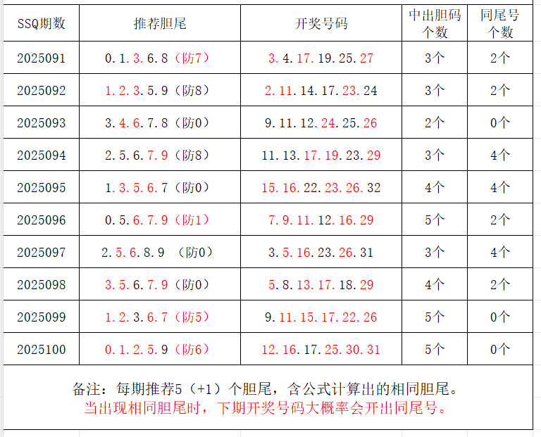 如图,每期推荐胆尾中出1-4个。上期推荐胆尾中出5尾5码!推荐胆尾是按照公式计算的顺序,不定位红球号码的顺序。本期推荐胆尾:1尾/5尾/4尾/6尾/0尾 。加推重点胆尾:***(会员专区可见)。推荐胆码号码:***(会员专区可见)。个人分析,仅供参考。