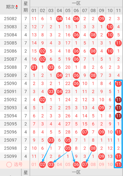 根据走势图可以看出当区段,089期开出04.06.08三个号码球,090期开出06.11四个号码球,091期开出了03.04二个号码球,093期开出了09.10二个号码球,094期开出了11一个号码球,095期没有开出码球,096期开出07.09.11三个号码球,097期开出了03.05一个号码球,098期开出了05.08二个号码球,099期开出09.11二个号码球 按照如此规律本期当前区可能会开出1双1单。我们看下当前区上期没有开出重叠号,那么本期当前区要定重叠号的情况下可关注11号码球。再看下当前区段上期开出09斜连号,当期选号得留意10斜连号。建议重点关注02.03.06.07.11