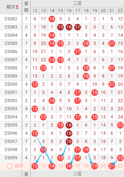 根据走势图可以看出当前区段,089期开出了18一个号码球,090期开出了12.21二个号码球,091期开出了17.19二个号码球,093期开出12一个号码球,094期开出13.17.19三个号码球,095期开出了15.16.22一个号码球,096期开出了12.16二个号码球,097期开出了16一个号码球,098期开出了13.17.18三个号码球,099期开出15.17.22三个号码球, 按照如此规律本期当前区可能开出1单1双。我们看下当前区上期开出17重叠号,那么本期当前区要定重叠号的情况下可关注15号码球。再看下当前区上期开出17斜连号,当期选号得留意斜连16号码球。本区重点关注12.14.16.19.21