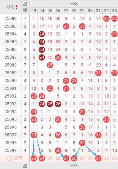 根据走势图可以看出当前区,089期开出了31.33二个号码球,090期开出了27.28二个号码球,091期开出了25.27二个号码球,093期开出了24.25.26三个号码球,094期开出了23.29二个号码球,095期开出来23.26.32三个号码球,096期开出了29一个号码球,097期开出了23.26.31三个号码球,098期开出29一个号码球 ,099期开出26一个号码球 ,按照如此规律判断本期当前区可能开出1双1单或2单。我们看下当前区上期没有开出重叠号,那么本期当前区要定重叠号的情况下可关注26码球。再看下当前区上期没有开出斜连号,当期选号得留意27斜连号。本区重点关注23.24.27.28.31