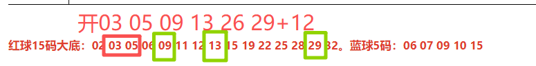 先回顾上期开奖号码:03 05 09 13 26 29—12,上期大底命中03 05 09 13 29。