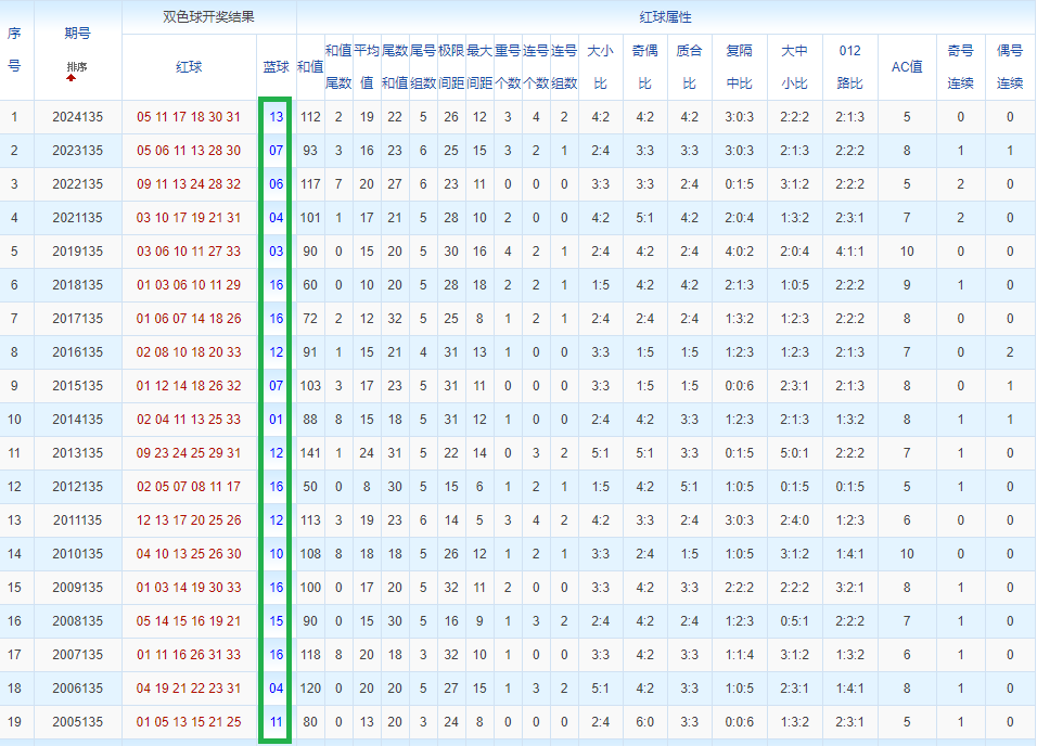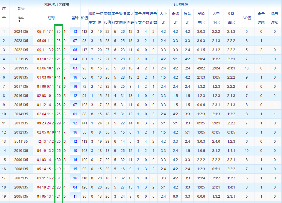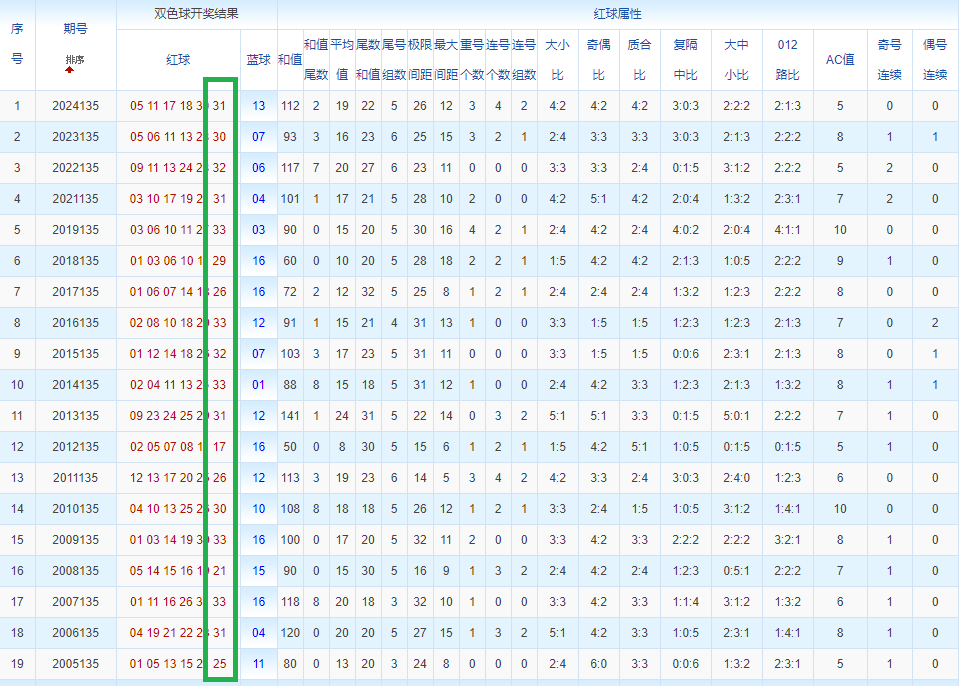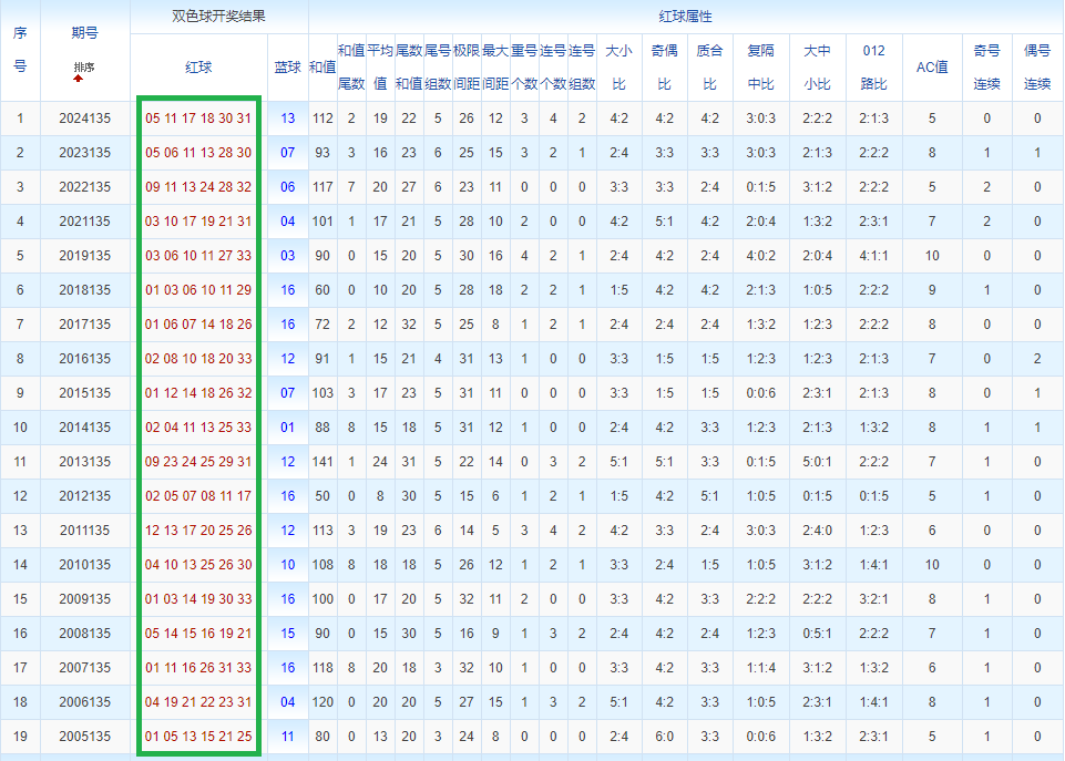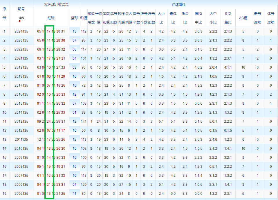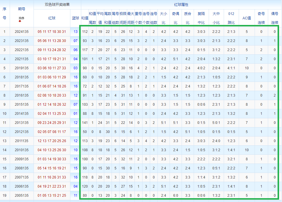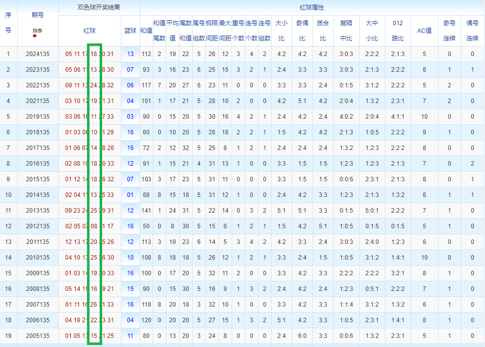 通过观察,我发现双色球往年同期的开奖数据与本期号码之间存在显著关联。具体来说,在红球中,从第一位至第六位,通常会有约4个位置上的数字与往年同期相同位置的号码一致;而蓝球号码中,也有多期开奖结果直接包含了往年同期的数字。因此,我们可以借助往年同期各位置上的号码,作为分析本期开奖情况的重要依据。在此基础上,还可结合往年同期的其他相关条件,进行综合性的号码组合推荐。