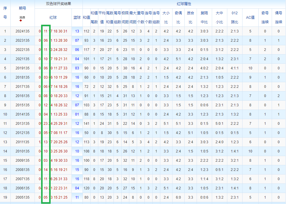 往年同期中选取出现次数靠前的数作为我们的分析对象,其数据有:11 13 01 33 31等