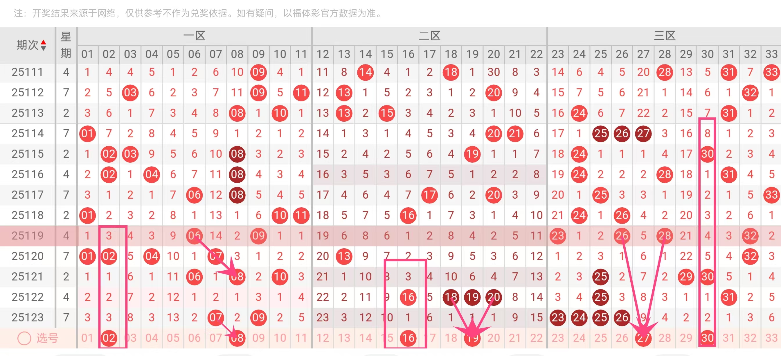 红球推荐:02、08、16、19、27、30