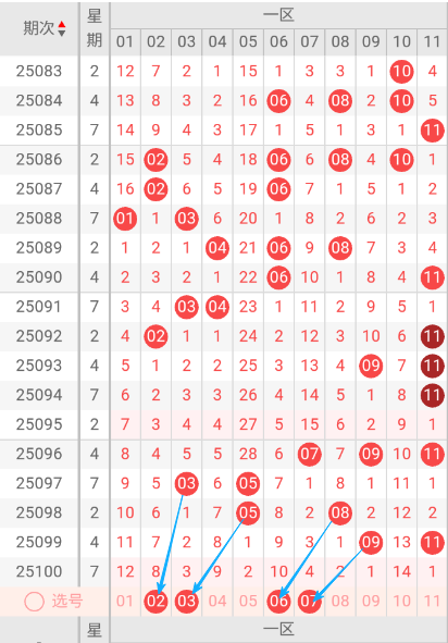 根据走势图可以看出当前区,090期开出了27.28二个号码球,091期开出了25.27二个号码球,093期开出了24.25.26三个号码球,094期开出了23.29二个号码球,095期开出来23.26.32三个号码球,096期开出了29一个号码球,097期开出了23.26.31三个号码球,098期开出29一个号码球 ,099期开出26一个号码球 ,100期开出了25.30.31三个号码球,按照如此规律判断本期当前区可能开出1双1单或1单。我们看下当前区上期没有开出重叠号,那么本期当前区要定重叠号的情况下可关注31码球。再看下当前区上期开出25斜连号,当期选号得留意32斜连号。本区重点关注23.27.28.32