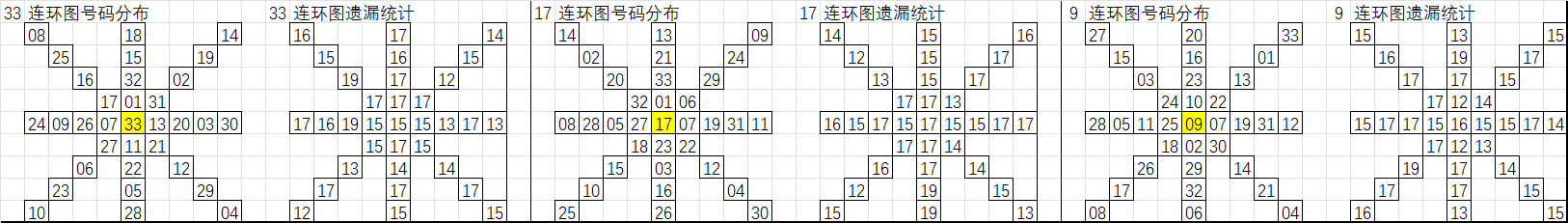 由于数据量大,不一一统计,下图为各个号码分别在33、17、9连环图上的遗漏统计汇总图: