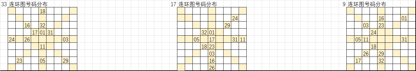 以上是遗漏大于16的号码分别在33、17、9连环图的分布,按照九转连环图选号规律,选取这些号码“环上”和“轴上”的相邻号码作为胆码,把这些胆码进行次数统计即可形成我们组号的排序,从出次多到少进行取号得出我们的大底。