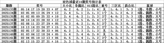 上期奇偶比为5:1,奇数活跃,近10期奇偶比为33:27,奇数红球活跃,其中奇数红球热