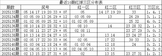 一区上期走温,出现1个奖号,近10期开出24个红球,表现非常活跃,本期预计走温,开出1-2个红球,参考号码02、06;二区上期走温,开出2个红球,近10期共开出16个红球,走势相对较冷,本期预计继续温冷,在2个以内出号,注意号码20;三区上期表现较热,出现3个奖号,近10期共开出20个红球,出号与理论个数持平,本期看好走热,开出3个红球,看好号码25、29、33;