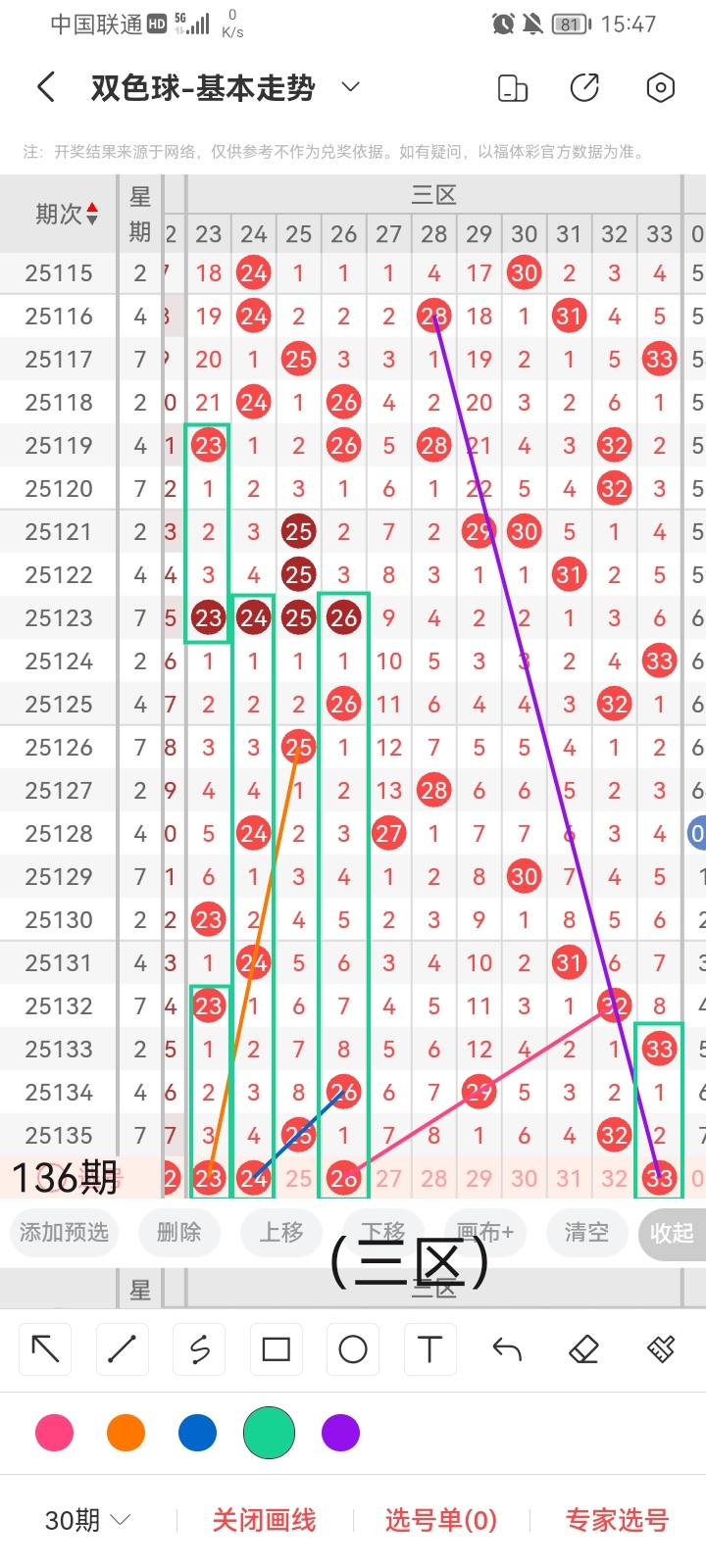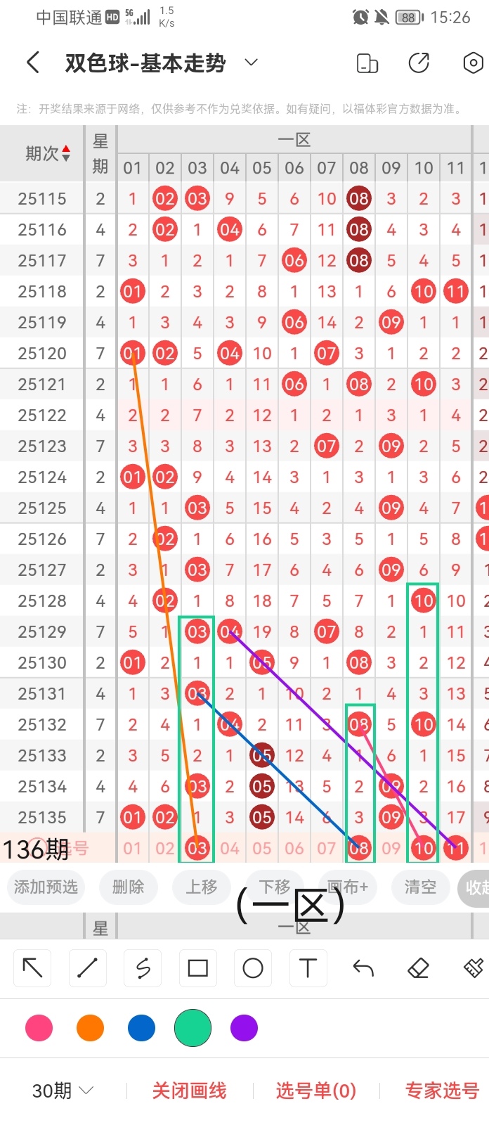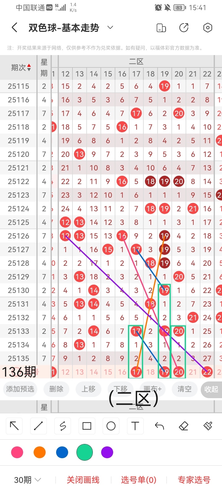 小梁根据图中画线思路,最后给大家汇总提供一下本期红球、蓝球数据,供大家参考: