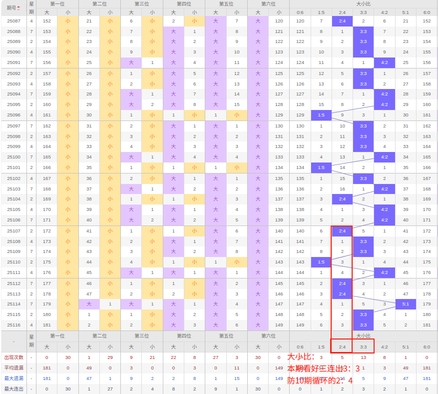 上期大小比:3:3,近10期大小比出现情况:2:4、3:3、3:3、1:5、4:2、2:4、2:4、5:1、3:3、3:3,最近10期出现4期3:3,出现1期4:2,出3期2:4,出现1期5:1,出现1期1:5,出现0期6:0,出现0期0:6,根据近10期规律本期看好连出3:3,防10期循环的2:4,综上所述推荐大小比推荐:2:4,重点关注:3:3。