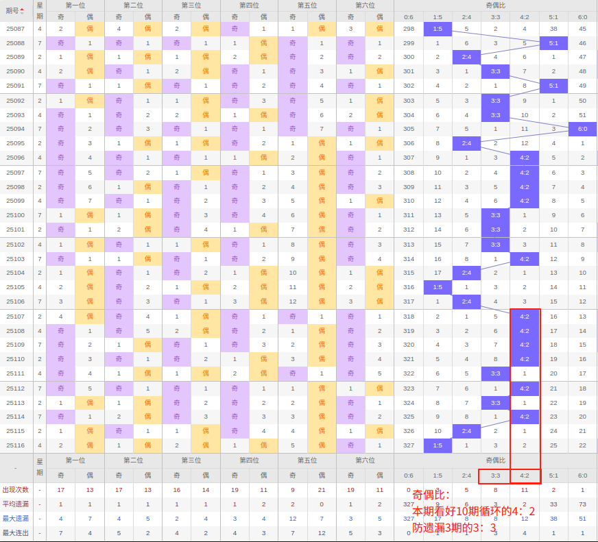 上期奇偶比:1:5,近10期奇偶比出现情况:4:2、4:2、4:2、4:2、3:3、4:2、3:3、4:2、2:4、1:5,最近10期出现2期3:3,出现6期4:2,出现1期2:4,出现0期5:1,出现1期1:5,出现0期6:0,出现0期0:6,根据近10期规律本期看好10期循环的4:2,防遗漏3期的3:3,综上所述推荐奇偶比推荐:3:3,重点关注:4:2。