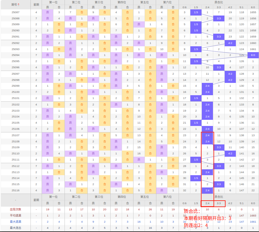 上期质合比:2:4,近10期质合比出现情况:2:4、2:4、3:3、4:2、1:5、3:3、2:4、1:5、3:3、2:4,最近10期出3期3:3,出现1期4:2,出现4期2:4,出现0期5:1,出现2期1:5,出现0期6:0,出现0期0:6,根据近10期规律本期看好隔期出3:3,防连出2:4,综上所述推荐质合比推荐:2:4,重点关注:3:3。