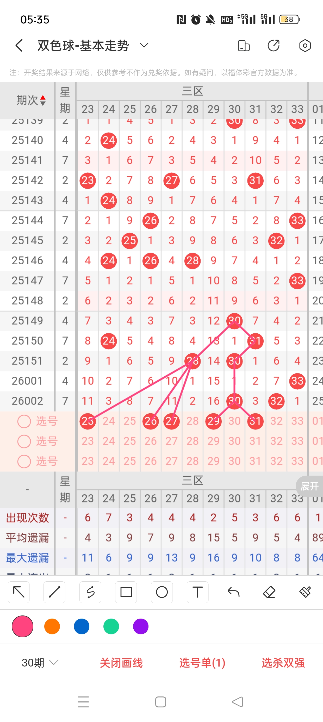 三区(23-33)近7期本区邻孤传5邻2孤0传,孤号热度高,本期着重邻传。近7期本区012路4:0:3,0路热度高,本着重1/2路。25、26、27分别遗漏11期、7期,三者与28之间呈现向左遗漏递减态势,需防。29、31分别遗漏16期、3期,两者依托30呈现正三角遗漏递减态势,需防。