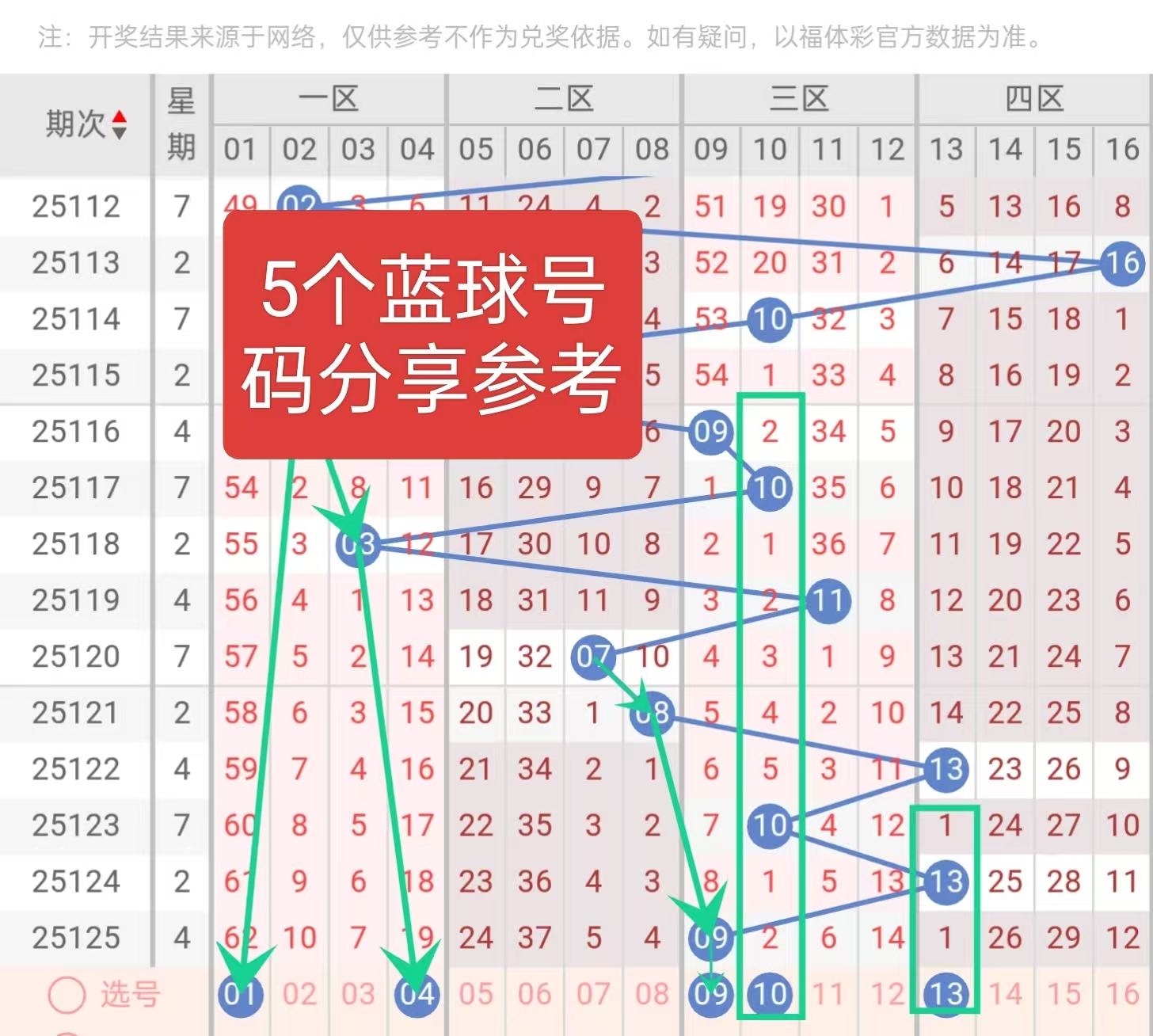 近10期蓝球出现频率较高的有09、10、13(各2次),这些热号延续可能性大,因此入选。冷号方面,01和04近10期未出现,遗漏值较高,回补概率大。蓝球大小比(1-8为小,9-16为大)近10期为4:6,大号略多,推荐中包括01(小)、04(小)、09(大)、10(大)、13(大),大小比为2:3,兼顾平衡。奇偶方面,蓝球奇偶近10期比例为5:5,推荐中奇球有01、09、13,偶球有04、10,奇偶比为3:2,略偏奇,但整体合理。