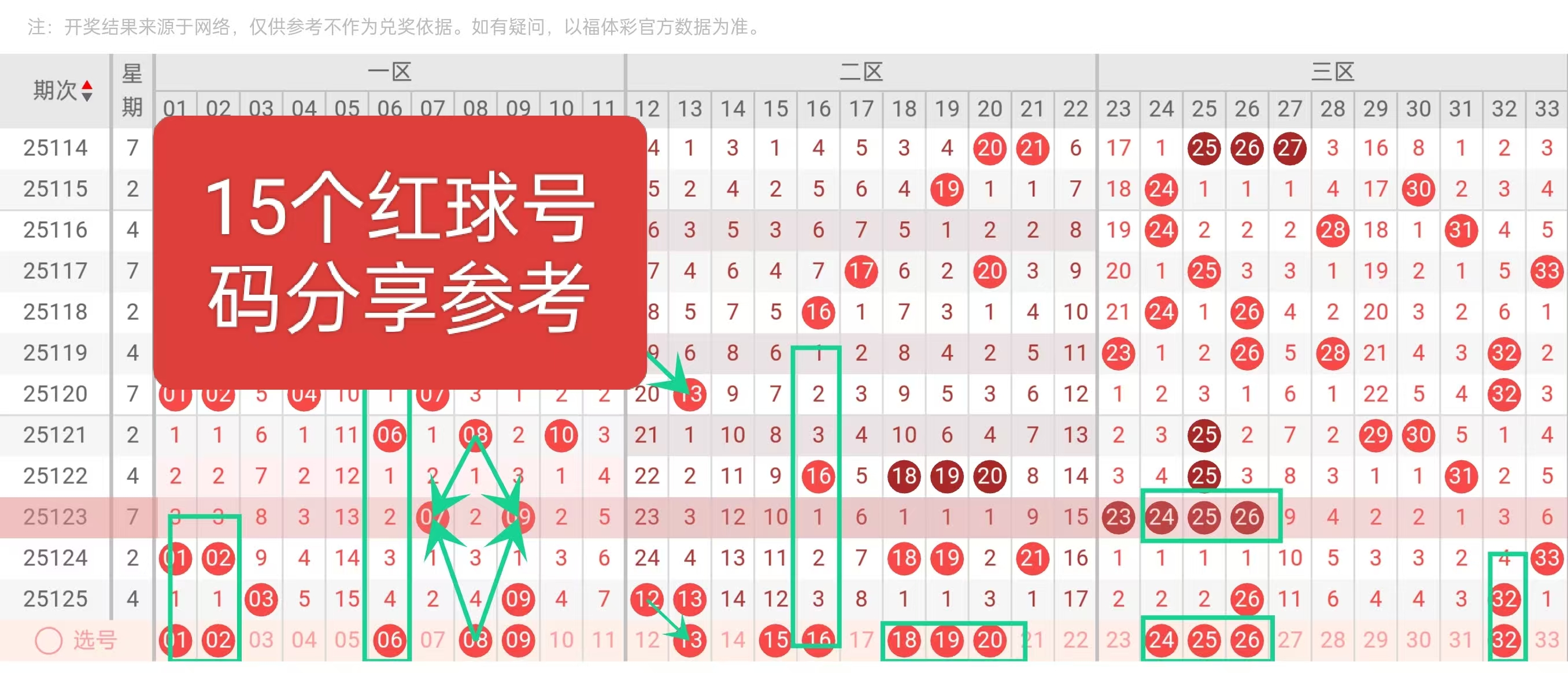 红球:01, 02, 06, 08, 09, 13, 15, 16, 18, 19, 20, 24, 25, 26, 32