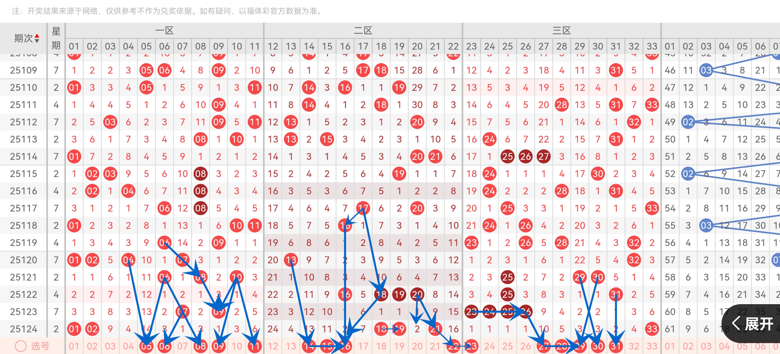 一区(01-11)出2码(01、02),二区(12-22)出3码(18、19、21),三区(23-33)出1码(33)。