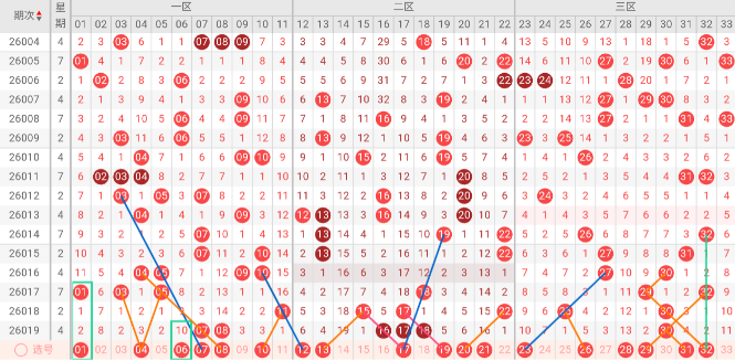 该区前4期稳定在2码,上期骤降至1码,形成长期平稳后小幅收缩的趋势。这可能是平台期结束、进入新阶段的信号。稳定期后往往有两种可能:继续维持或放量反弹。结合和值需求,本期放量反弹概率更大。出号量有望回升至2-3码。关注~,凤尾~。建议关注号码:23、26、29、31、32。